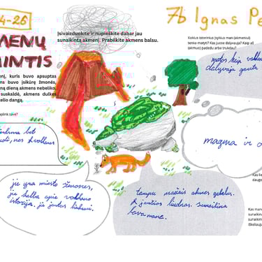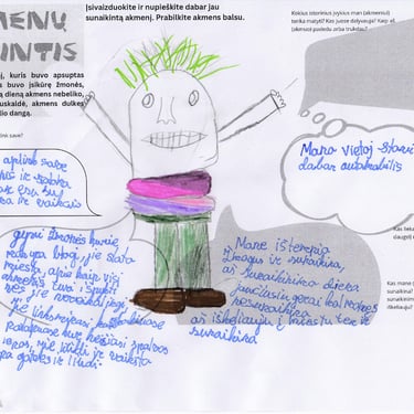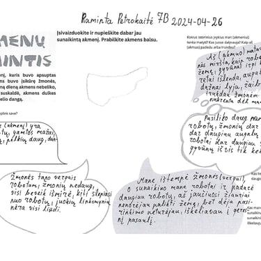 Kaip aš (akmuo) padedu arba trukdau? Kokie žmonės gyvena netoli manęs (akmens)? Ką jie veikia? Apie ką kalbasi? Kaip jie linksminasi ir kaip liūdi?